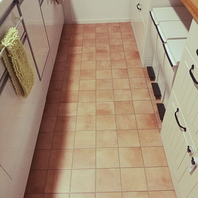 14年3月のdiy 洗面台② 床のクッションフロア貼り替え プロヴァンス風といえば 「これやー、完璧やん」と テラコッタタイル風を選択 なぜ?なぜーー? 今なら、古材風木目を選ぶのにさ なぜこんなに、好きなものがブレるんだろうか? ლ(゚д゚ლ)明るいテラコッタ調タイルの玄関♪DIYで完成♪ 今回は家の顔である玄関を明るくと思い購入しました。 サイズに迷いましたが、一般的な玄関サイズの為、小さ過ぎず、大きすぎずの15×15のこのタイルにしました。 特に苦労したのは、たたきとあがりの境 玄関ポーチのタイル貼りです。 まず、おおよその場所決めをします。 テラコッタタイルを並べてみて、置き場所とかを確認します。 これで、目地の幅などを決め、できるだけきれいに収まるレイアウトを考えていきます。 次に水糸をはり基準を作ります。